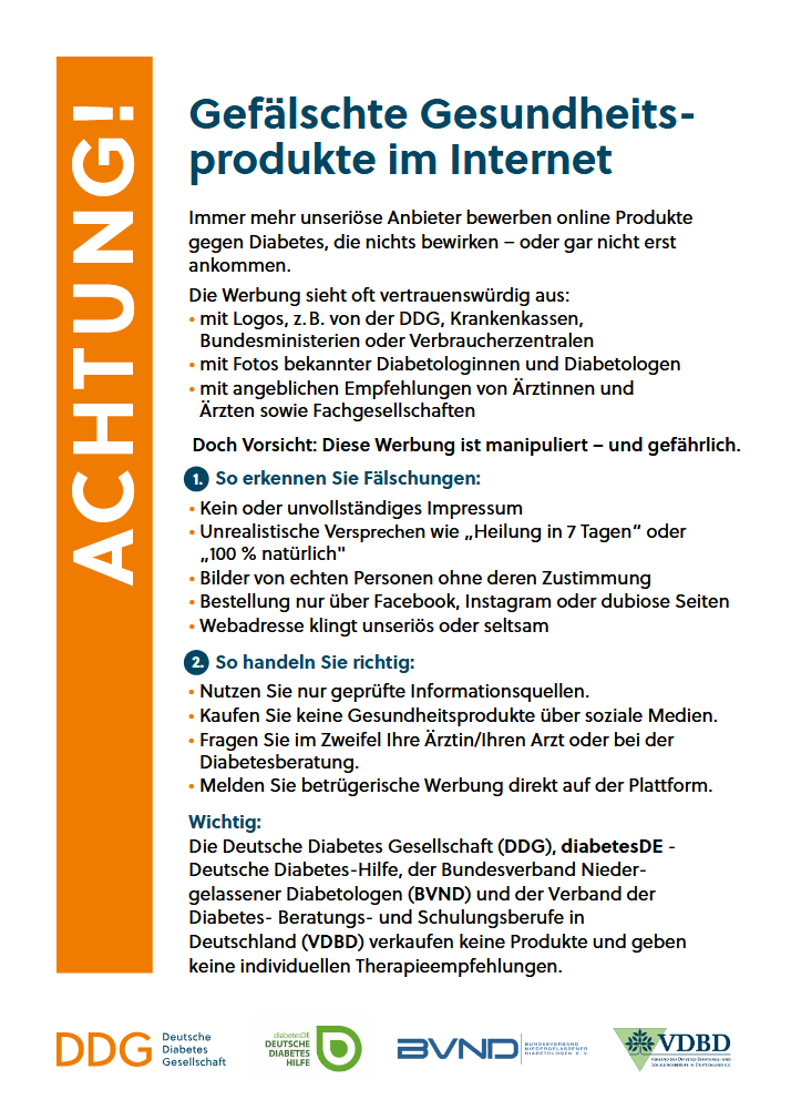 DDG, diabetesDE, BVND und VDBD warnen gemeinsam vor dubiosen Online-Angeboten für Menschen mit Diabetes